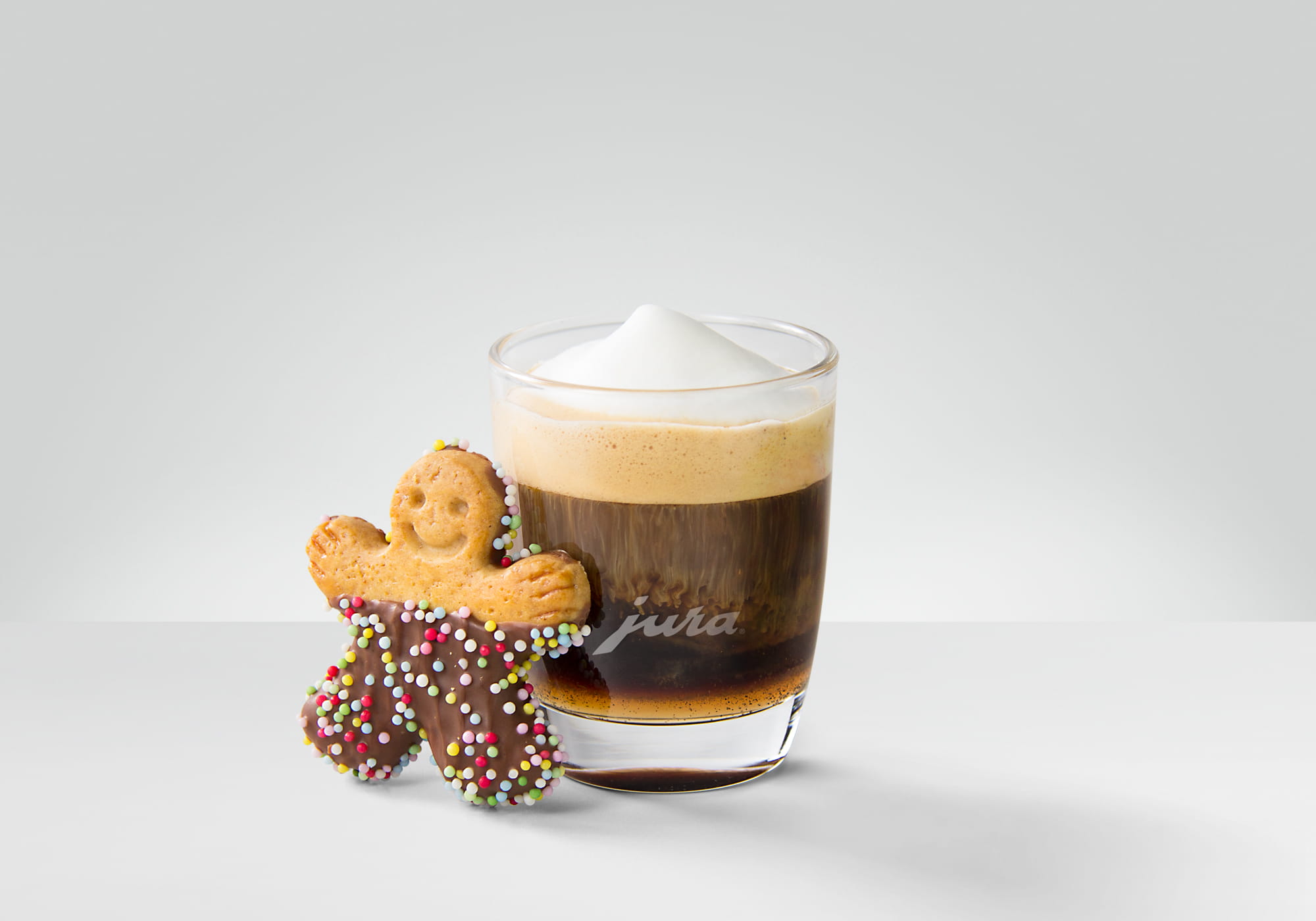 • Налейте ванильный сироп и добавьте специи для имбирных пряников в стакан для эспрессо.